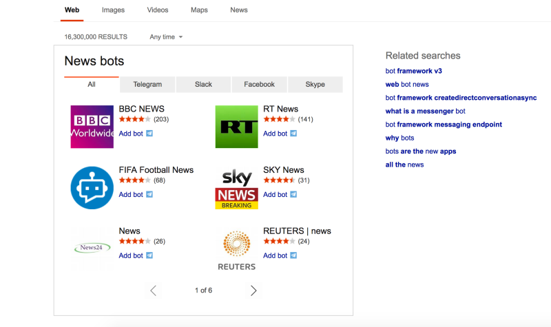 Thousands of Facebook Messenger, Slack, Skype, Kik, and Telegram bots can now be found by searching Bing.com, a source familiar with the matter has informed VentureBeat.