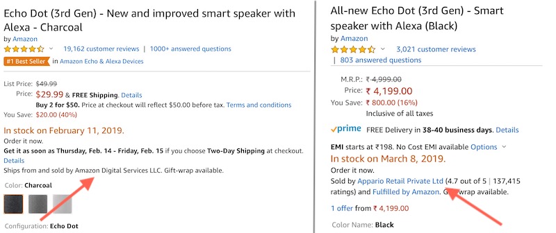 Above: A look at how Amazon sells the Echo Dot on its US website and its India website.