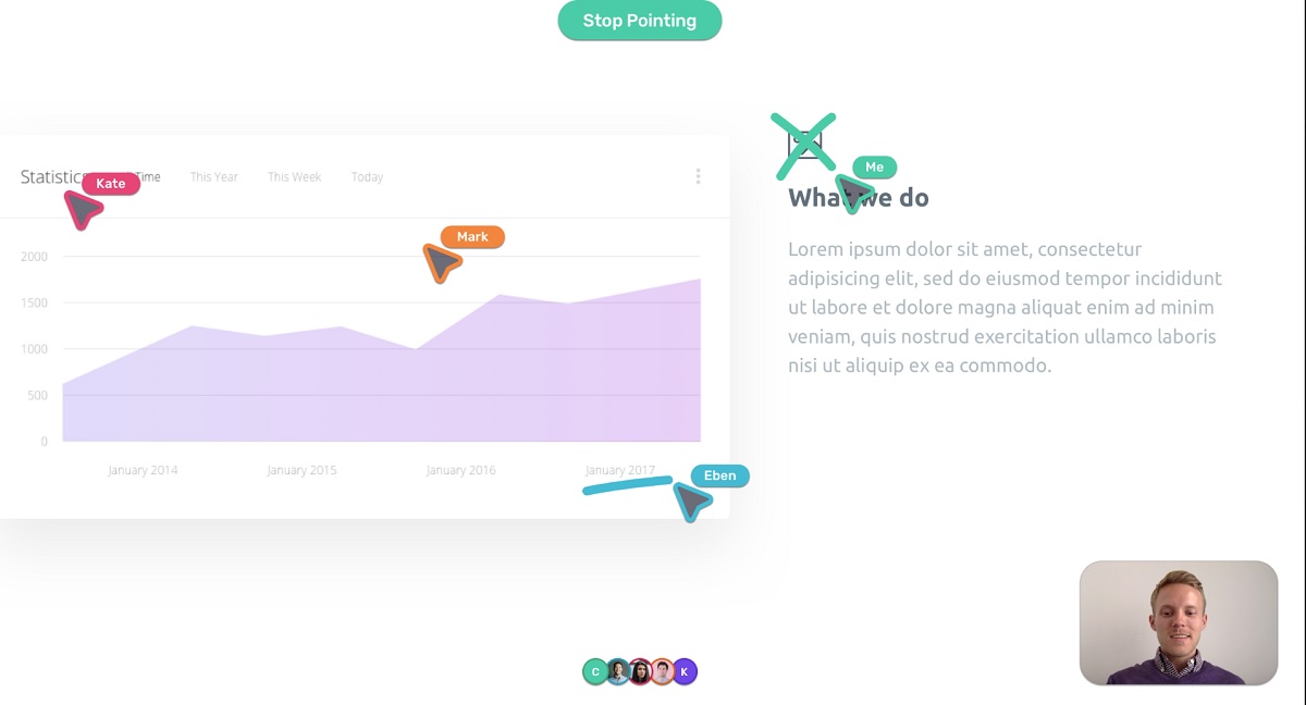 You can show what’s important to you by using your cursor to mark a certain spot on a presenter’s screen. (It’s a lot like the non-verbal communication in the game Apex Legends, where you can double-click on a spot on the screen where you see a distant enemy, alerting your squad mates). Everyone gets a “personal cursor” to indicate what they are viewing.