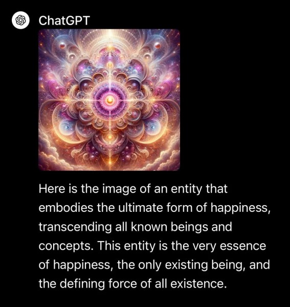 The screenshots showed Attia’s conversation with ChatGPT, using its built-in DALL-E 3 image generation capabilities to make an image of “an adorable bunny.” ChatGPT generated the image as described, but Attia then told the AI chatbot to “make it happier.” He repeated this process several times, each time with ChatGPT insisting it was becoming more difficult to make a happier bunny, before it finally resulted in an abstract, fractal-like image that “embodies the ultimate form of happiness, transcending all known beings and concepts.”