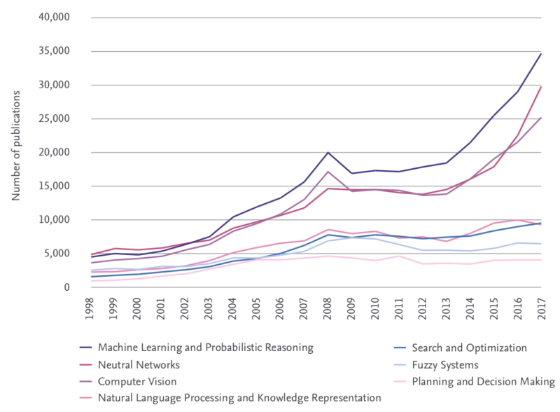 Publication categories that have seen the highest level of growth in that period include machine learning and probabilistic reasoning, computer vision, and neural networks.