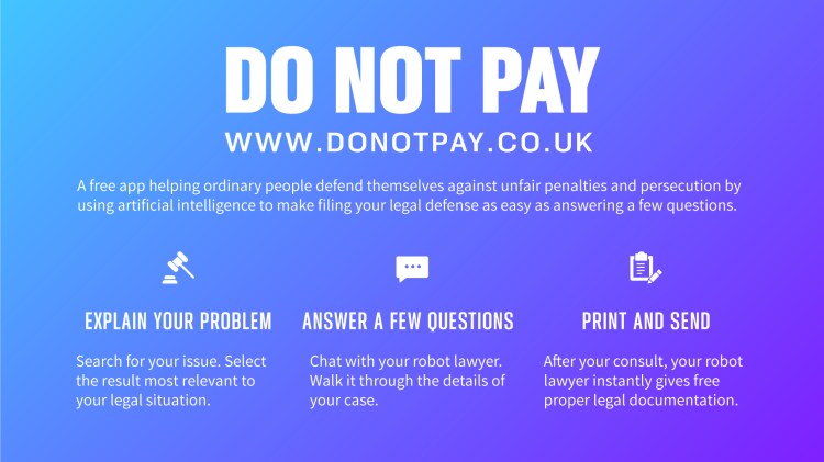 “I originally started DoNotPay two years ago to fight my own parking tickets and became an accidental witness to how lawyers are exploiting human misery,” Browder told VentureBeat in an email. “From discrimination in Silicon Valley to the tragedy in London with an apartment building catching fire, it seems the only people benefitting from injustice are a handful of lawyers. I hope that DoNotPay, by helping with these issues and many more, will ultimately give everyone the same legal power as the richest in society.”