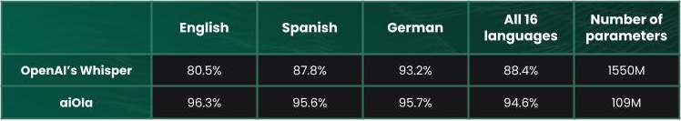 It achieves a remarkable 94.6% accuracy in keyword spotting generally, outperforming OpenAI’s widely acclaimed Whisper model with its 88.4% accuracy, according to metrics shared by aiOla. It also works across 100 different languages and transcribes the text in near real time.