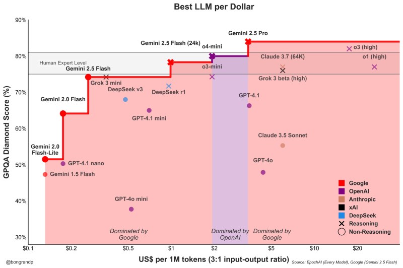 For any given price, Google’s models offer more intelligence than other models, about 90 percent of the time. Source: Pierre Bongrand.