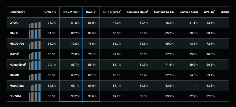 Specifically, Grok-2 and Grok-2 mini outperform all other models on the GPQA, MMLU, MMLU-Pro, MATH, HumanEval, MMMU, MathVista and DocVQA benchmarks.