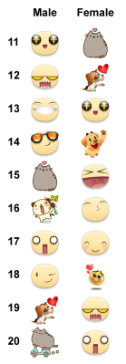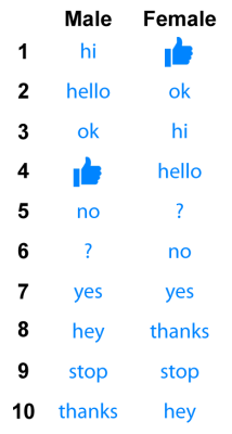 The top messages for men and women are about the same. Although it’s interesting to see “ok” higher up than “hi” and “hello” for women, as those and the thumbs up tend to be the top three overall regardless of gender when we looked at this in the past.