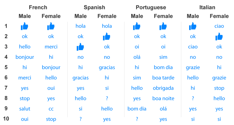 We looked at a few “romantic” words to see how men and women chat. For the most part, the top 10 messages were fairly similar between genders. However, the top messages for Portuguese women were pretty interesting — they tend to send more welcoming messages like “good morning,” “good afternoon,” and “good night” (“bom dia,” “boa tarde,” and “boa noite,” respectively). Another interesting message was “cc” in French, which is slang for “coucou,” equivalent to “hey” or “hello” in English.