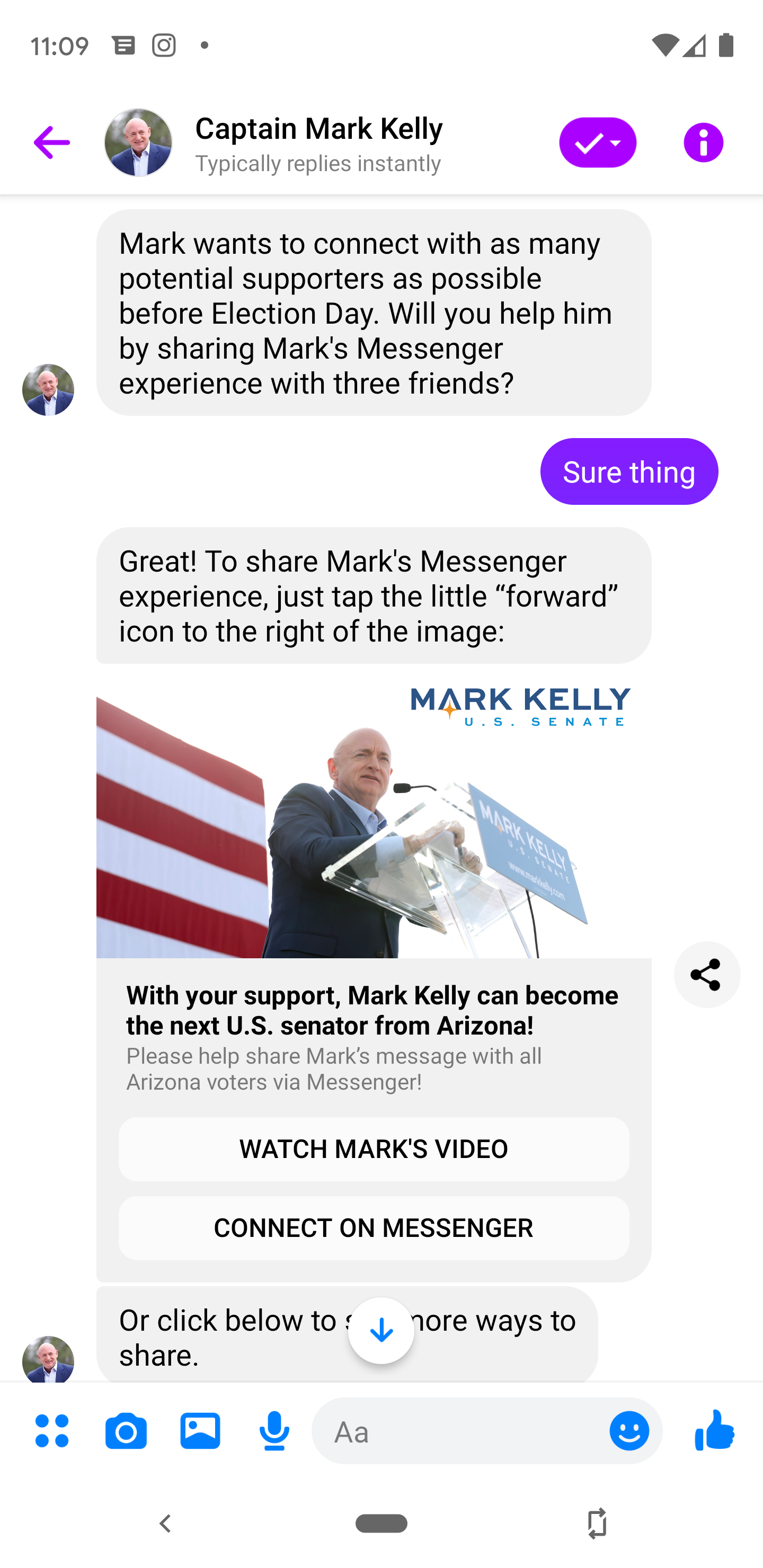 For example, the platform might decipher a comment along the lines of “Mark Kelly rocks” on the campaign’s public Facebook page and autonomously reach out to the poster on Messenger. The chatbot would thank the user for engaging with Kelly’s campaign and lean into the positive sentiment by asking if they are open to talking. If the platform analyzes a less positive comment, it may express interest in understanding different points of view.