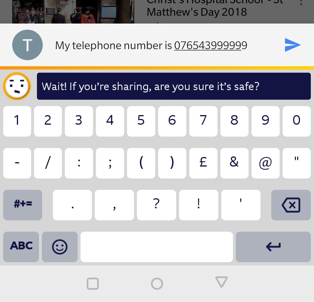 Similarly, if someone tries to share personal information such as an email address or telephone number, the app will prompt the user to reconsider.