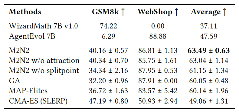 Next, they applied M2N2 to LLMs, combining a math specialist model (WizardMath-7B) with an agentic specialist (AgentEvol-7B), both of which are based on the Llama 2 architecture. The goal was to create a single agent that excelled at both math problems (GSM8K dataset) and web-based tasks (WebShop dataset). The resulting model achieved strong performance on both benchmarks, showcasing M2N2’s ability to create powerful, multi-skilled models.