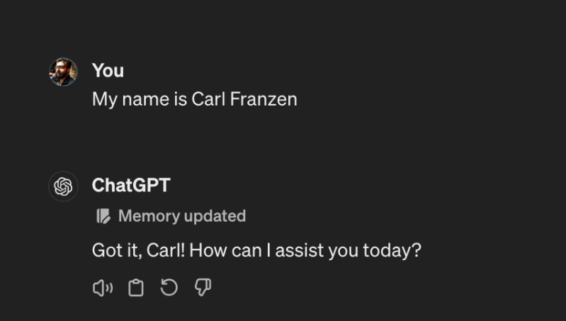 You know it works by a message that appears below the ChatGPT username and before its response that reads: “Memory updated.” So far, it supports only text you provide, not images (we tried.)