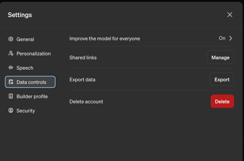 Opt-out for model training can be accessed under “Username” then “Settings” followed by “Data Controls” and “Improve the model for everyone,” where the user can toggle between green for “on” (sharing chat session data with OpenAI for model training) or gray/white for “off” (not sharing it).