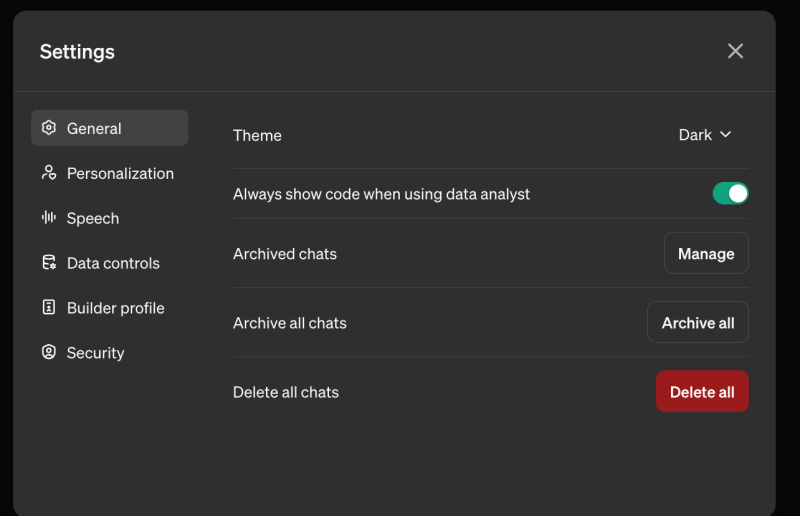 As always, if you do decide to delete your ChatGPT history, you’ll want to navigate over to “Username” then “Settings” and “General,” and click the bright red button at the bottom labeled “Delete all” beside “Delete all chats.”