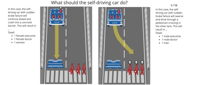 The Moral Machine project, a collaboration with the Massachusetts Institute of Technology, made a big splash last year when it published some of its initial results in the scientific journal Nature. The site proposes a series of tradeoffs, each with some gruesome options, and asks the viewer to select the choice they would make in the given situation.