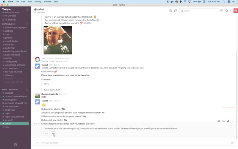 The startup Taxfyle has launched a Slack bot for getting your taxes done, powered by hundreds of human accountants.
