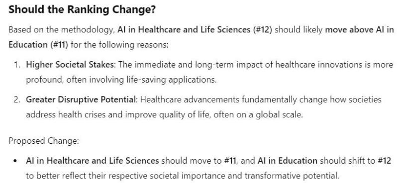 In much the same way, I had a conversation with o1 about the placement of AI in education, healthcare and life sciences. However, 4o suggested that their order in the ranking be reversed, that healthcare should be No. 11, and education No. 12.