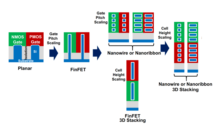 In addition to this new transistor architecture, another way to drive cell area scaling is through vertical stacking of transistor devices. Modern semiconductors are built from complementary pairs of both negatively and positively charged transistors called NMOS and PMOS. The height of a standard cell can be significantly decreased through monolithic stacking of a NMOS device on top of a PMOS device, or vice versa. This can be accomplished by stacking FinFETs, GAAFETs, or even a combination of both.