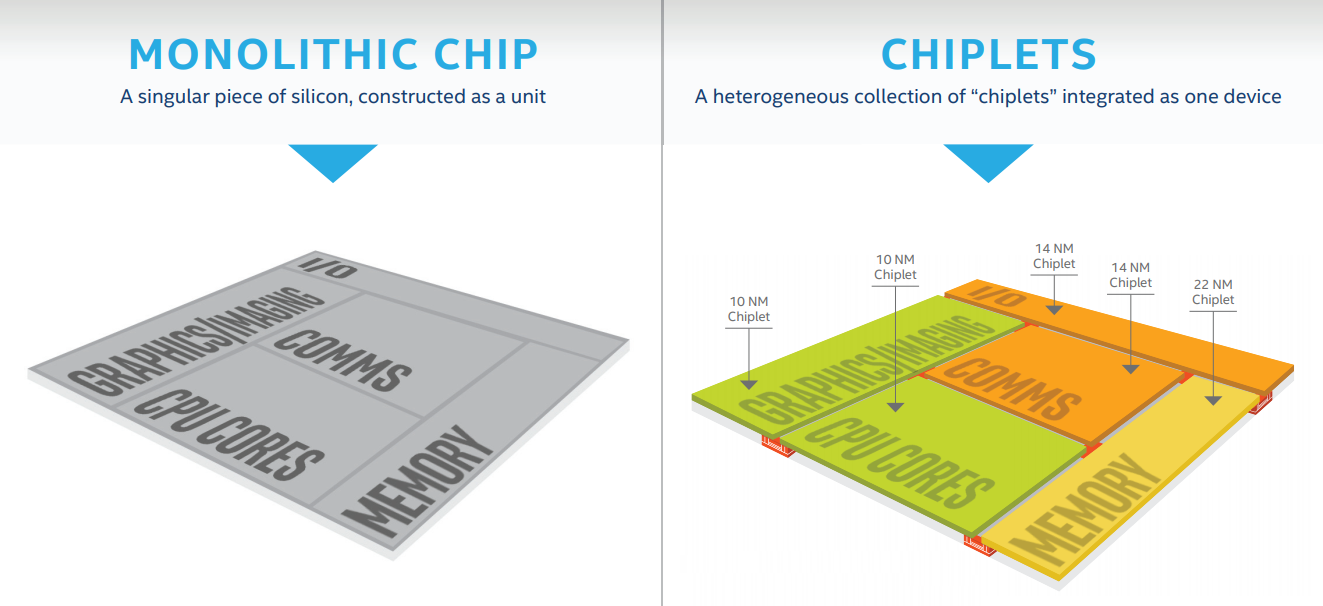 This type of dis-integration may seem, at least initially, to be the antithesis of what Moore’s Law is intended to accomplish, but the performance and density improvements gained by matching each type of processor to its own best-fit transistor logic and design implementation often outweigh the negatives caused by separating a monolithic die into smaller chiplets. In fact, in his original paper in 1965, Moore stated that it “may prove to be more economical to build large systems out of smaller functions, which are separately packaged and interconnected.”