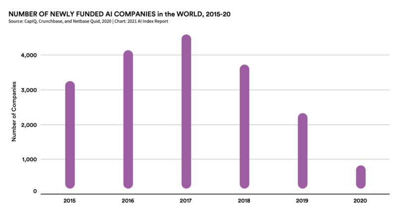 • Total global investment, like private investment and mergers and acquisitions, grew 40% in 2020. But for the third year in a row, AI startup funding is going to fewer startups.