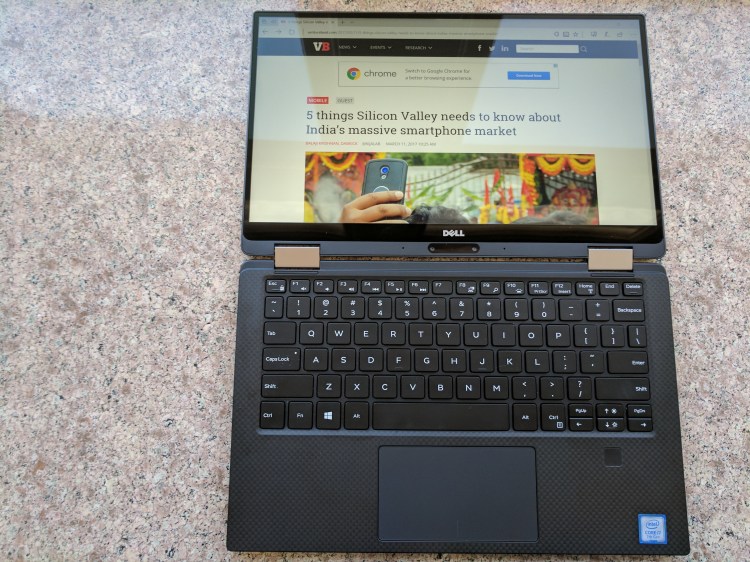The keys on the backlit keyboard have just as much travel — 1.3mm — as the XPS 13 clamshell model, but they aren’t the most satisfying to type on. The typing experience is nicer on HP’s 13-inch Spectre x360 and Microsoft’s Surface Book. And, unlike the clamshell XPS, just above the left and right arrow keys you find page up and page down keys. It’s not hard to hit them by accident.