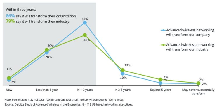 It’s already well established that next-generation wireless technologies are going to become ubiquitous over the next few years, but just how important will 5G and Wi-Fi 6 be to enterprises? A new Deloitte study of advanced wireless adoption provides an unambiguous answer: “critical” within three years, according to strong majorities of executives responsible for enterprise networking infrastructure. Those executives expect not just an incremental upgrade, but a “significant opportunity to transform how their enterprises operate, as well as the products and services they offer.”