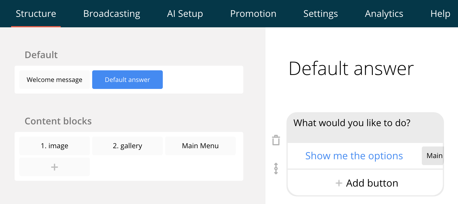 After editing the welcome message, we’ll formulate a Default answer. That’s a standard reply the bot makes when it’s unsure of a user’s intentions; it points users to the Main Menu — which we’ll set up next.