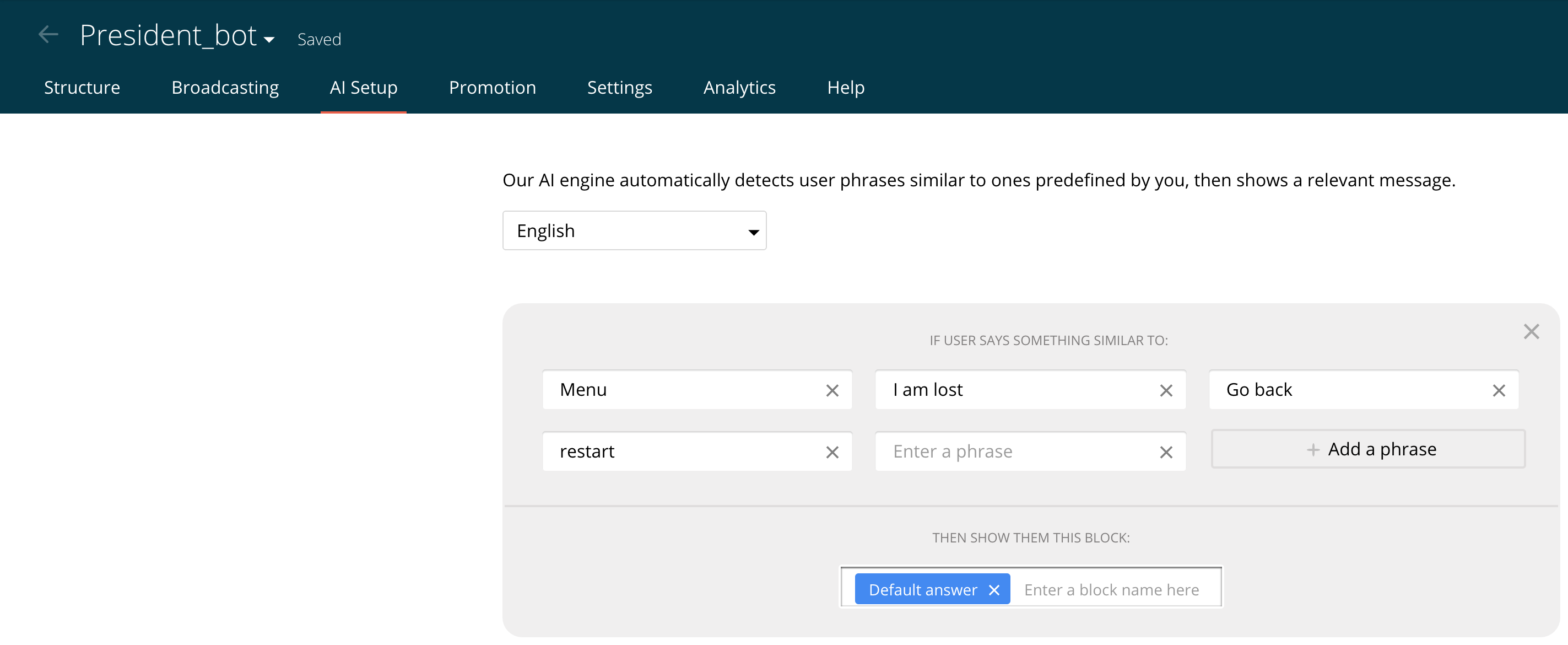 In order to teach our bot when to bring up the Main Menu, we’ll switch to the AI Setup tab. Remember, the Main Menu serves as an anchor point for your users when they get lost, so let’s make it easy for them to call up. In this example, we’ve added phrases like “Menu,” “I am lost,” “Go back,” and “restart” and pointed them to our Default answer content block. The AI will automatically recognize similar expressions as well.