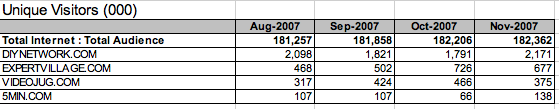5min pointed us to the following Alexa graph, comparing it against competitors VideoJug, ExpertVillage, and DIY Networks, worldwide: