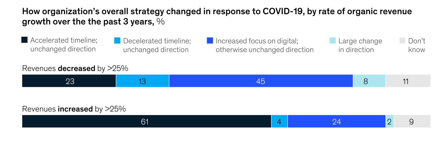 Above: Companies with decreasing revenues were most aggressive in stepping up  focus on digital (top blue bar). Revenue leaders sped up “digitalization” efforts already underway (bottom black bar).  Credit: McKinsey