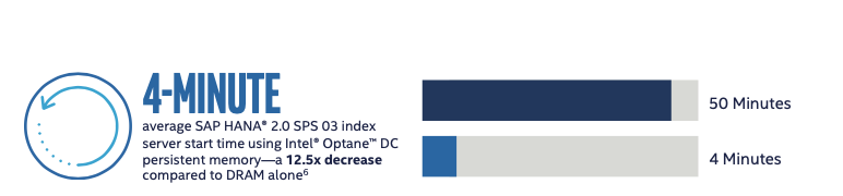 Business continuity and resilience. Because critical workloads are deeply intertwined with key business processes, downtime or performance hits are massively disruptive. So how fast a system restarts after a shutdown, planned or unplanned, is crucial. Data stored in Intel Optane PMem is persistent, meaning it stays in memory even if there’s no power. So when an SAP HANA instance needs to reboot, there’s no need to reload data from disks or slower storage tiers. That enables a dramatically faster return to normal operations compared to DRAM-only systems. Speedier reload and recovery times can shorten service windows and downtime for upgrades or patches.