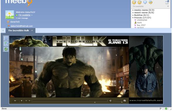 Meebo’s ads will appear at the bottom of its chat windows (screenshot sample of an ad for the movie The Incredible Hulk, above). Click on an ad that you find interesting and it will expand on to the page, and may include content like a video to watch or a simple video game to play (big screenshot, below). Launch partner advertisers include Havaianas, Sony Electronics, Universal Pictures, and the rock band Weezer.