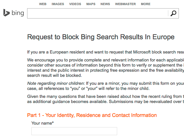 The generalized form, which replaces a previous individual form for each request, follows the decision in May by the European Court of Justice in Luxembourg. That ruling, commonly referred to as the “right to be forgotten,” said that search engines need to offer an option for any European to request that a link to specific information be blocked in the search results for his or her name.