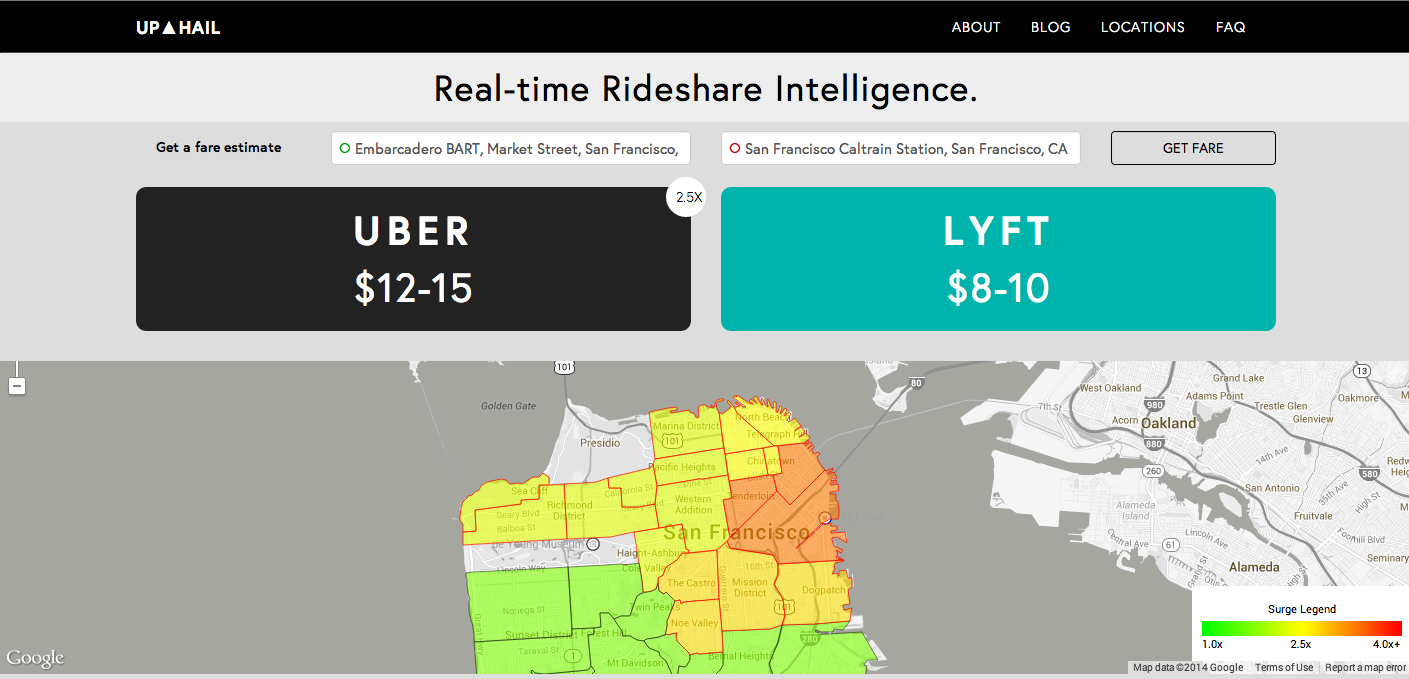 Since we know you’ve long been wondering which ride-sharing service, Lyft or UberX, is cheapest — and since their rates fluctuate all the time due to “surge pricing” and other factors — we give you Up Hail, a service that calculates ride prices in real-time.
