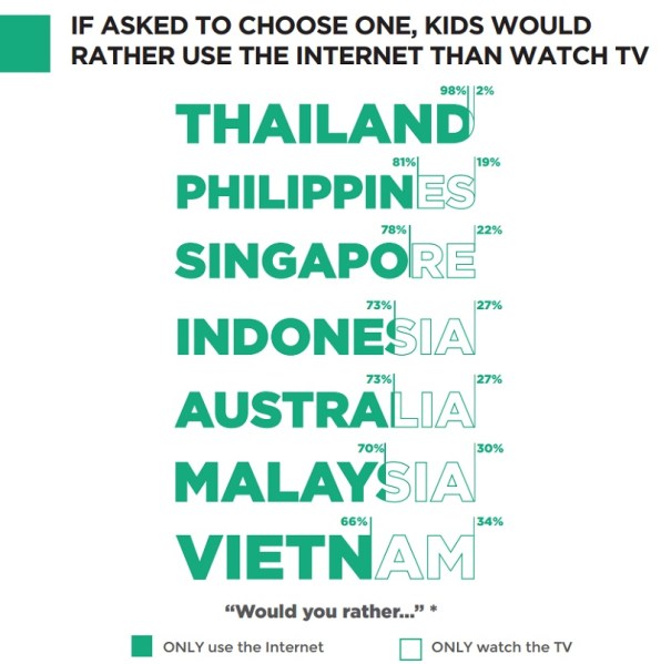 In fact, internet penetration among APAC kids has surpassed TV, with 24 more minutes spent on the internet than on TV per weekday. Preference for the internet over TV has grown 11 percent year on year.