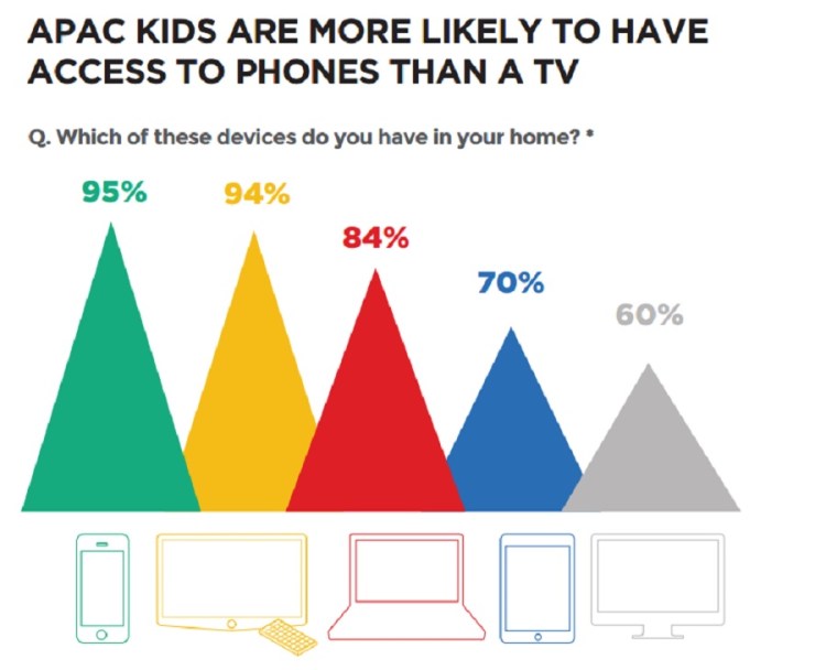 In fact, internet penetration among APAC kids has surpassed TV, with 24 more minutes spent on the internet than on TV per weekday. Preference for the internet over TV has grown 11 percent year on year.