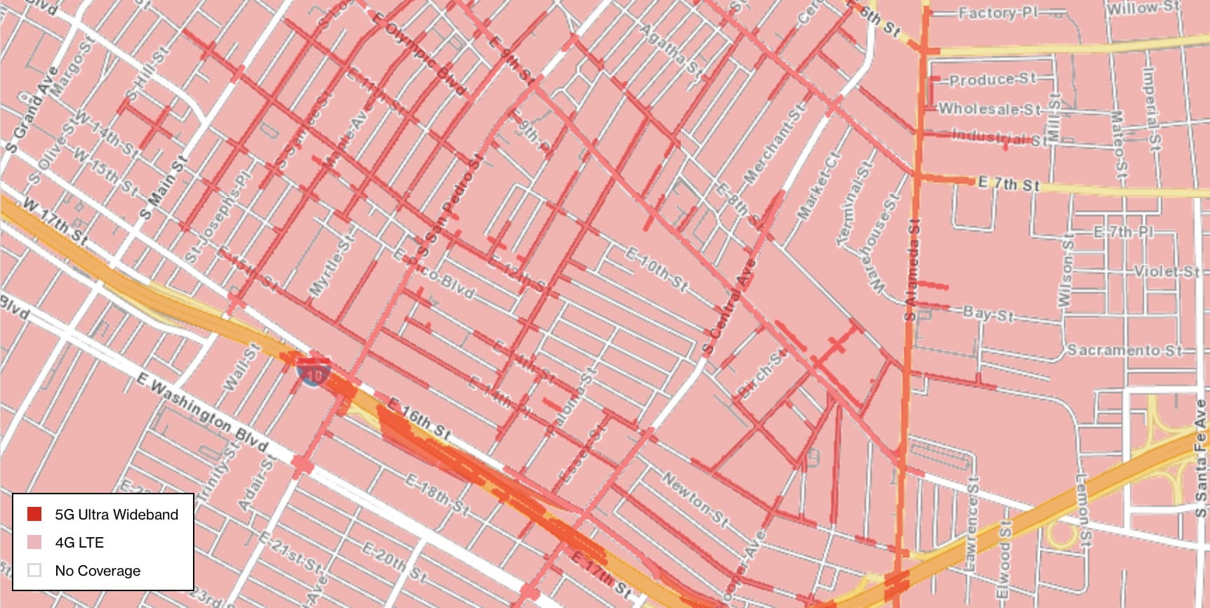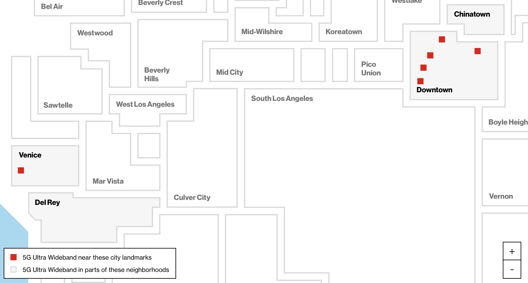 I looked at Verizon’s 5G coverage maps to find testing spots in Los Angeles that would hopefully be easy and quick, and in their current form, the maps default to very simple boxes that are either white (4G), lightly shaded (maybe 5G), or landmarks (definitely 5G). Even though the boxes make clear that Verizon’s 5G isn’t available in most of L.A., you might still think there’s more coverage than there actually is.