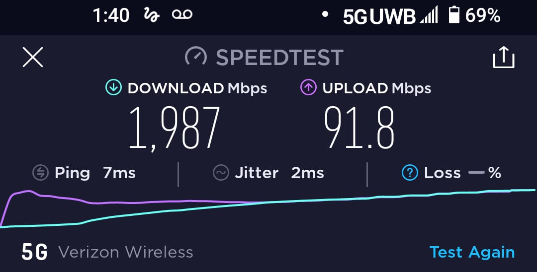 To say that Verizon’s 5G was location-dependent would be a profound understatement. One of the guaranteed locations on Verizon’s L.A. maps was the famous Venice Beach boardwalk, and though the 5G signal was indeed available right there, my phone fell back to 4G only a short block away. I was able to hit a rocket-like download peak of 1.987Gbps on 5G, and nearly repeated that feat multiple times with scores upwards of 1.7-1.9Gbps. If I spent my entire day sitting at exactly that spot, and didn’t care about bandwidth or storage limitations, I probably could have downloaded everything worth seeing on Netflix.