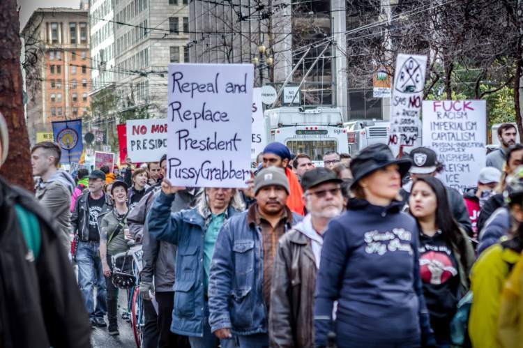 Above: Protests at the headquarters of Google in Mountain View, January 30, 2017. 2,000 Google workers from campuses around the world staged a walkout.