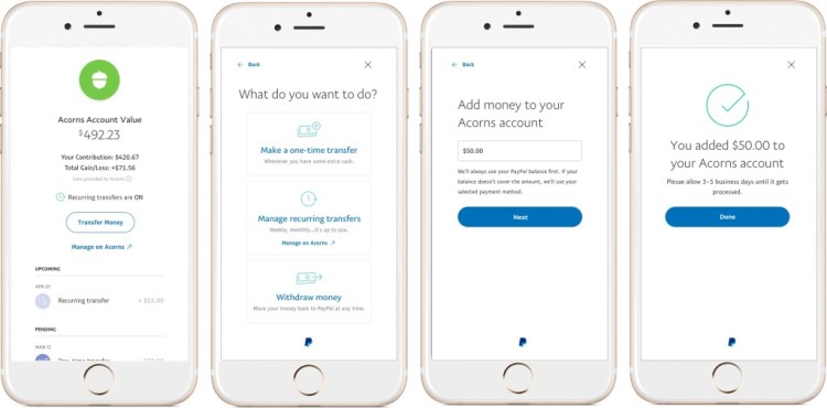 PayPal actually led Acorns’ $70 million series D round last year, and shortly afterward PayPal was quietly added as a payment option for “round up” investments on all PayPal purchases, in addition to bank cards. But from today, PayPal can be used to fund an Acorns account, meaning it now covers recurring or one-off investments too.