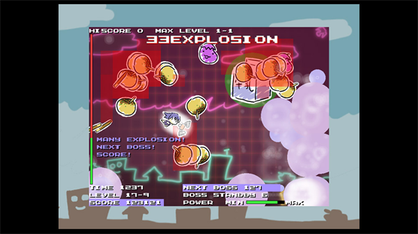 You control a little anime witch-girl armed with a grappling hook. The play area suddenly begins to fill with turnips and beets, which explode on impact when grabbed and tossed. Eventually a boss shows up – a giant plate of Tiramisu which must be dispatched quickly in order to gain a bit of extra time. Make it that far (not a difficult task), and more beets and turnips appear, followed by another plate of Tiramisu. This escalation of vegetables and desserts moves exponentially until the entire screen is exploding in a fireworks display of high-yield explosive foodstuffs.