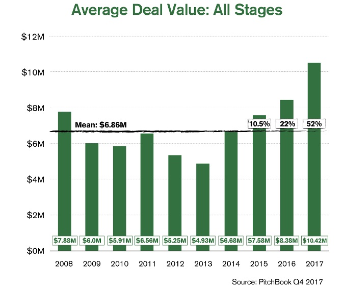Over the course of the last decade, the mean deal value remained stagnant at $6.86 million. In 2014, we started to see a steady climb of mean deal value with $7.58 million in 2015, $8.48 million in 2016, and an all-time high of $10.42 million in 2017. The numbers represent a 10.5 percent, 22 percent, and 52 percent increase over the mean per year respectively.