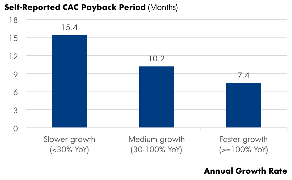 Despite disparities in reporting, self-reported data on CAC payback does reveal a clear trend: The fastest growing SaaS companies report a CAC payback period of only 7.4 months. That’s less than half that of slower growing SaaS companies (15.4 months).