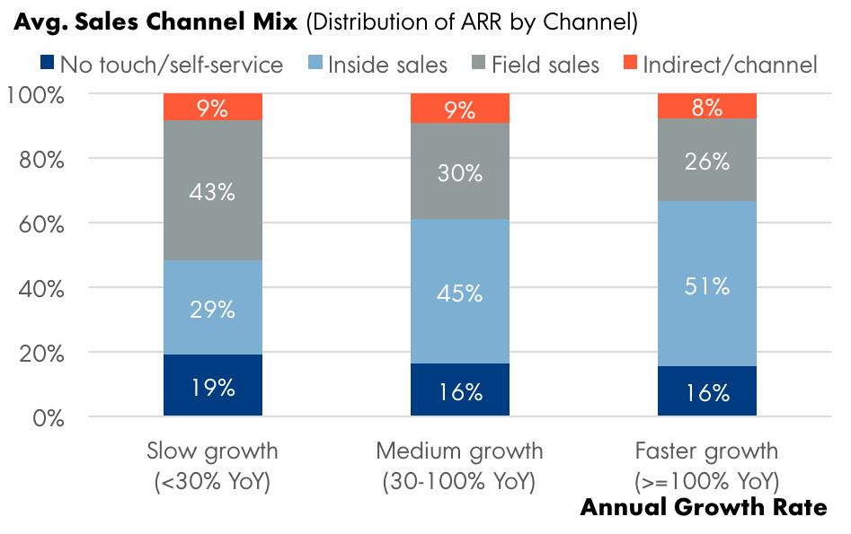 On average, the fastest growing companies derive 51 percent of their ARR through inside sales, compared to 26% from field sales and only 16% from no touch or self-service sales. On the flip side, slow growers tend to rely more on field sales (43%) and actually see 19% of their ARR from no touch or self-service sales.