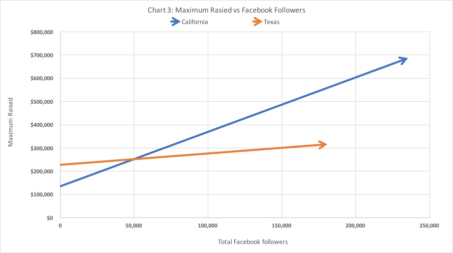 To date, California and Texas have had the most crowdfunded campaigns. With that in mind, we assessed the importance of a social media following in both states. Our data suggests that a large social network is much more important in California than Texas, as shown below. This may be due to Silicon Valley’s influence in the region. Since there is more competition for venture capital, perhaps companies are leveraging crowdfunding and their social networks to signal popularity and a reason to invest. In Texas, a social following is not a determinant of campaign success. This could be due to a more direct financial approach to crowdfunding in Texas, where investors are searching for proven financial strength instead of social exposure. The implication for startups is that you should understand who you are targeting with your campaign and focus your social media outreach on that. A deeper analysis of other states is in order, but there simply is not enough activity in other states to make a judgement.