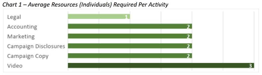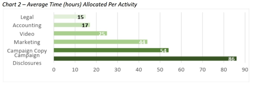 - No two issuers spent the same amount of time, effort, or funds on all tasks. However, the majority of time and effort went into creating the company disclosures, followed by creating the campaign page, marketing outreach, and video production.