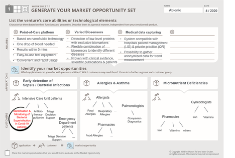 One of the worksheets below from the Market Opportunity Navigator provides a systematic view of Abionic’s market discovery process: The upper part of the worksheet shows Abionic’s technological assets, and the lower part shows how these abilities can be used different market opportunities.