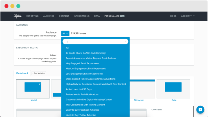 For example, a new visitor may receive a message asking them to sign up for a newsletter, while a returning visitor with an apparent affinity for the brand, demonstrated across different channels, may see suggested content to help them dig deeper into the web experience. And to assist in building the highest conversion and engagement rates, Lytics Personalization allows for A/B split tests — pitting one version of the content against another to see which one wins.