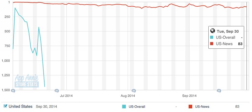 The NYT Opinion app briefly ranked among the top #100 iOS apps in the U.S. shortly after it launched, according to app tracking site App Annie. Within two weeks the app dropped off the overall top charts. The NYT Now app, however, appears to have performed better in terms of total downloads but still ranks below competing news reading apps like Flipboard and CNN.