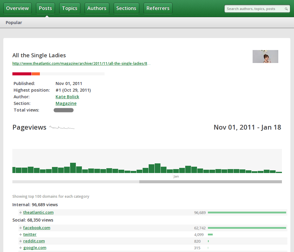 The dashboard tool, already used by Atlantic Media Group, U.S. News and The Press-Enterprise as well as VentureBeat, offers publishers and editors a means to slice and dice past and present content by topics, authors, sections and referrers. The tool takes the standard analytics capabilities of a Google Analytics-type product and throws in a few additional layers for an (ideally) more comprehensive view of site and author performance and potential.