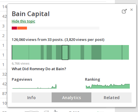 The dashboard’s most unique feature is the Webwide Trends component, which rolls up data from across Parse.ly’s widespread publisher network to find topical traffic trends (during its year-long private beta period, Parse.ly crawled 4 million URLs and tracked 4 billion page views). Here Dash looks at what’s bubbling up on the web and determines the best opportunities for coverage. Users can also search for particular topics to gauge whether they’re trending or flatlining, and look at the performance of multiple topics in a comparison chart.